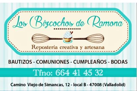 Repostería Dulces Tartas Galletas Comercio Celebraciones Cumpleaños Bautizos. Comuniones. Cumpleaños. Bodas. Repostería artesana. Merengue y fondant. Bizcochos. Tartas. Galletas. Cupcakes. Por encargo. Dirección Camino Viejo de Simancas, nº12 F.47008. Valladolid. Teléfono 664 414 532. Enlace Fb Los Bizcochos de Ramona