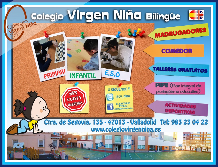 Colegios Enseñanza Escuelas Talleres Educación Infantil, Primaria y Secundaria. Bilingüe.Madrugadores.Comedor.Talleres gratuitos.PIPE, Plan Integral de Pluringüismo Educativo.Actividades deportivas. Dirección Ctra. de Segovia, nº135.47013. Valladolid. Teléfono 983 230 422. Enlace www.colegiovirgennina.es