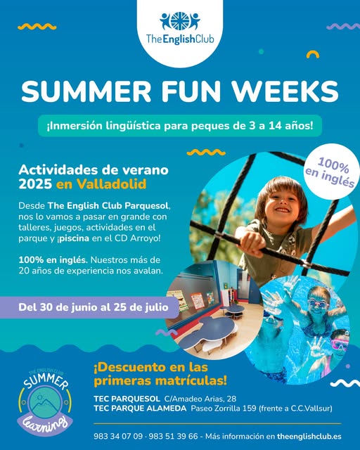 En nuestro campamento combinamos el aprendizaje del inglés con actividades lúdico-acuáticas en el Xperience Sport Club en Arroyo (a escasos minutos de nuestro centro de Parquesol). Todo el equipo de TEC se desplaza con los alumnos, en bus privado, al Centro deportivo. El club dispone de piscina semiolímpica y piscina de chapoteo para los más pequeños, ambas exteriores con vistas excelentes. Allí nuestros alumnos disfrutarán de actividades lúdicas acuáticas dirigidas y controladas por monitores técnicos del centro y con nuestro profesorado acompañando a nuestros alumnos y utilizando el inglés en todo momento.